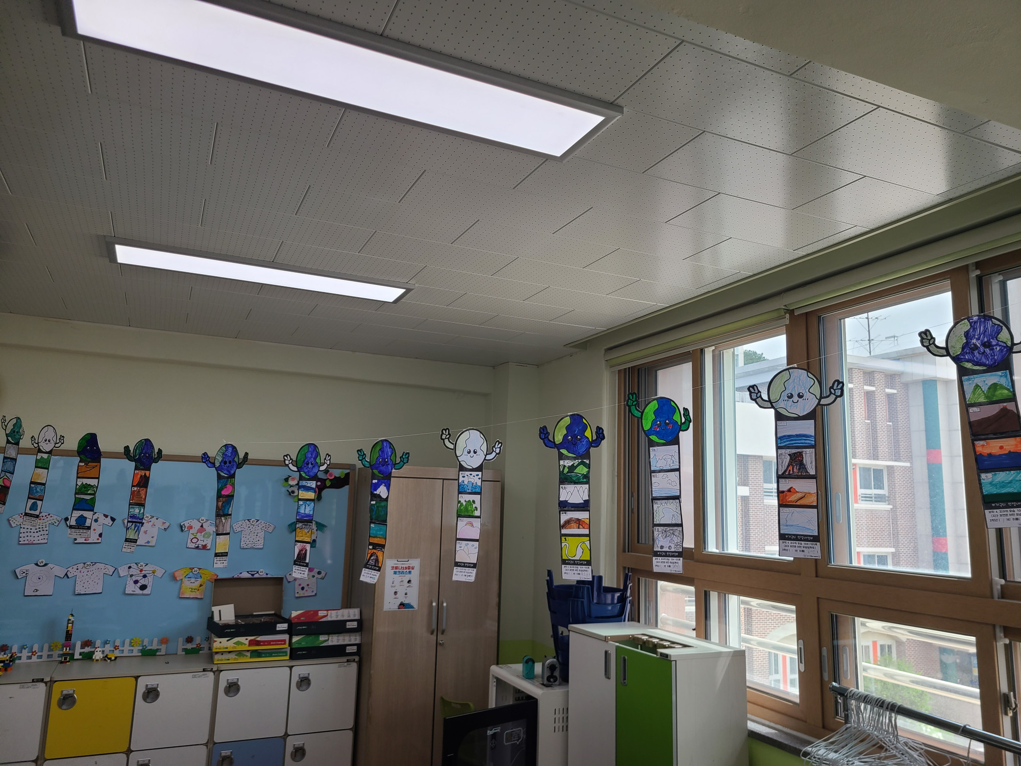 학기초에 낚시줄 하나 걸어 놓으면 한 학기는 튼튼하게 작품 전시에 활용할 수 있습니다. 선풍기를 잘 안 써서 선풍기에 낚시줄을 고정해놨어요. A4 크기의 작품 전시에 아주 좋습니다! 테이프로 고정해주면 나중에 칼로 테이프 부분만 잘라주시면 돼요. 한 학기 정도 지나면 테이프 잔해물이 많아서 새학기에 새 낚시줄을 걸어줍니다^^