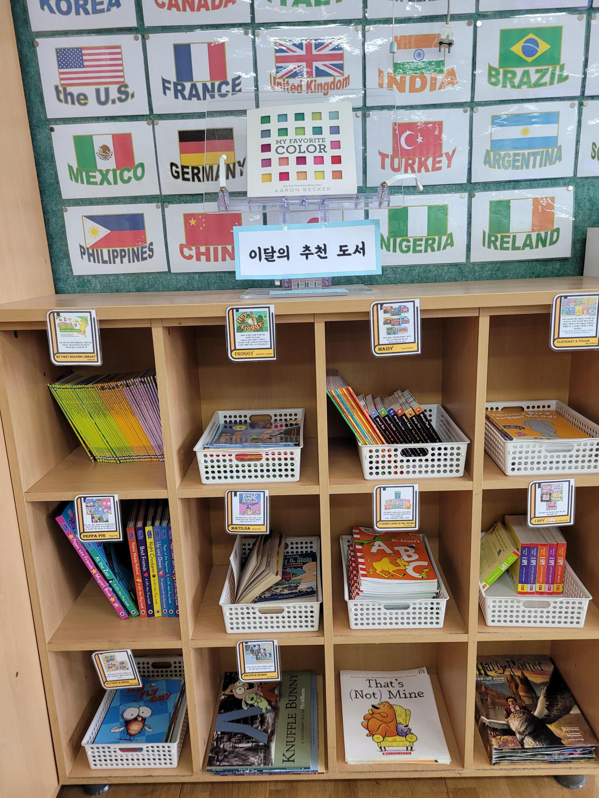 아이스크림 바구니를 이용해서 교실 속 작은 영어 도서관을 만들었어요. 수업 중 영어그림책을 활요해서 수업을 재구성하고, 방과 후 아이들과 자유롭게 책을 읽을 수 있는 시간도 마련하고 있답니다.