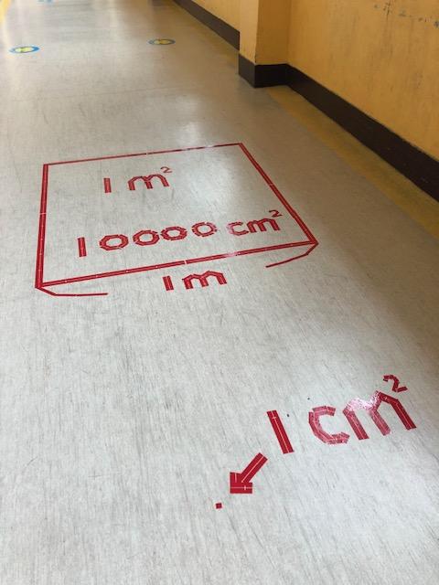 5학년 수학 1제곱 미터 배우기 전에 복도와 교실 바닥에 1제곱미터 정사각형을 그려놓았어요. 퀴즈라고 제시했더니 아침부터 아이들이 온갖 답들을 이야기 합니다. 갈고리, 주차구역, 낚시바늘, 닻 등등 물음표는 질문이라는 뜻이라고 설명해 주니 한 아이가 자를 들고 길이를 재기 시작하고 답을 맞혔어요. ^^ 지나가는 5학년 아이들 모두 궁금해 하면서 갔어요.