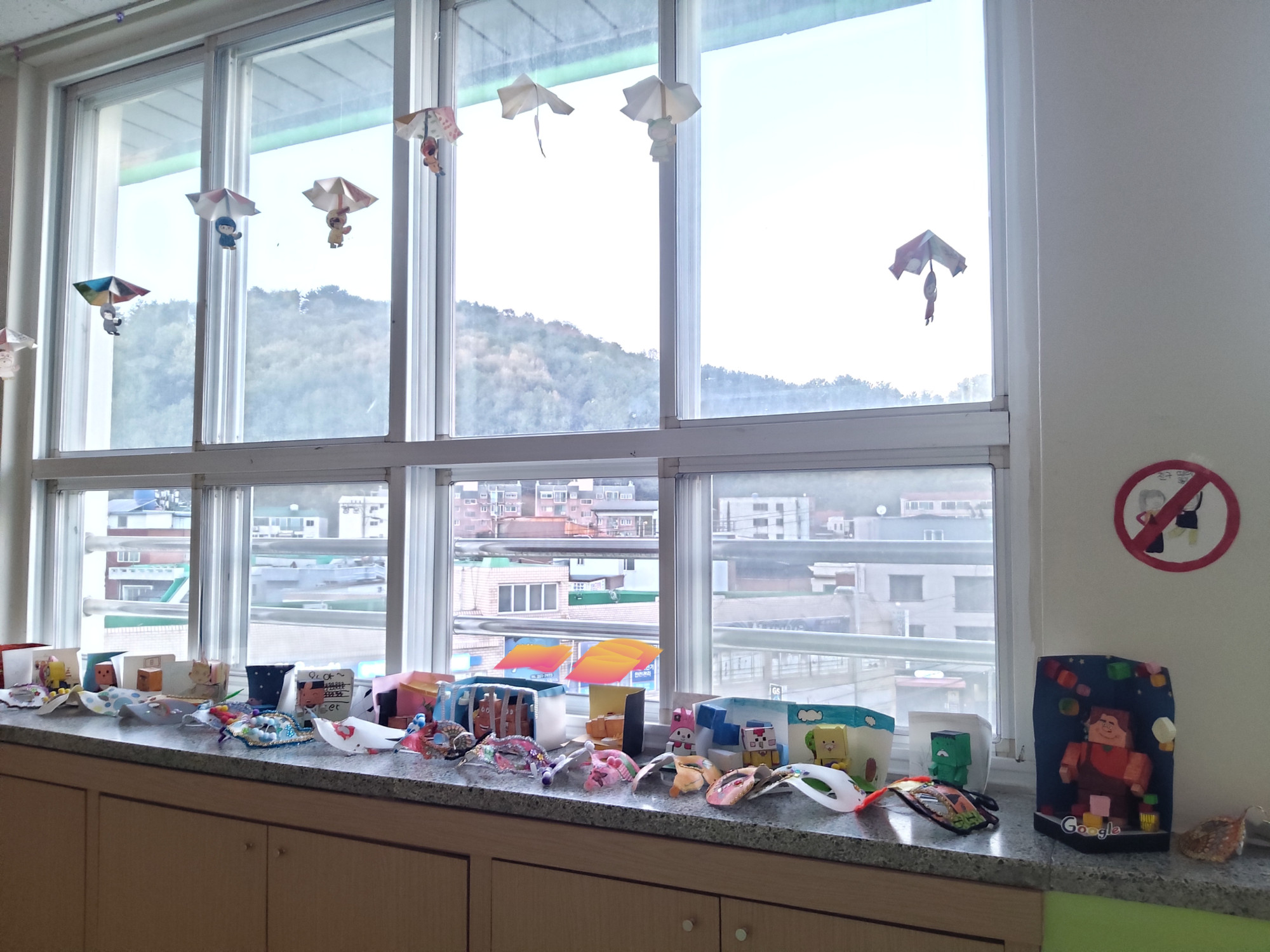 아이스크림의 다양한 상품을 활용해서 창문부터 선반까지 모두 아이들의 작품으로 가득 차 있습니다.