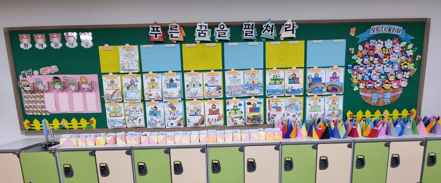 매월 교실 뒷판을 조금씩 바꾸고 있는데요. 이번 달은 아직 교체를 못했네요. 왼쪽부터 독서판, 가운데는 아이들 작품 전시판, 오른쪽은 학급 전체 활동 결과물 전시하고 있어요.