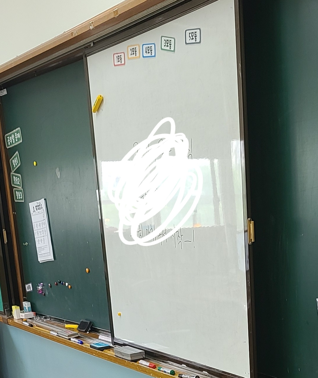 저희 학급 교실의 전면입니다. 학생들이 자신의 의견을 공유하는 학습보드판을 비치하여 언제든 서로의 생각을 알 수 있도록 활동에 활용하고 있어요. 저희 학교는 분필 칠판을 사용하는데, 아이들이 자주 사용하기에는 화이트보드가 편한 것 같아 대형 고무자석을 부착하였습니다. 화이트보드로 바뀐 뒤 아이들도 저도 만족도 200% 상승이에요! 화이트보드와 꼭 짝꿍으로 ...