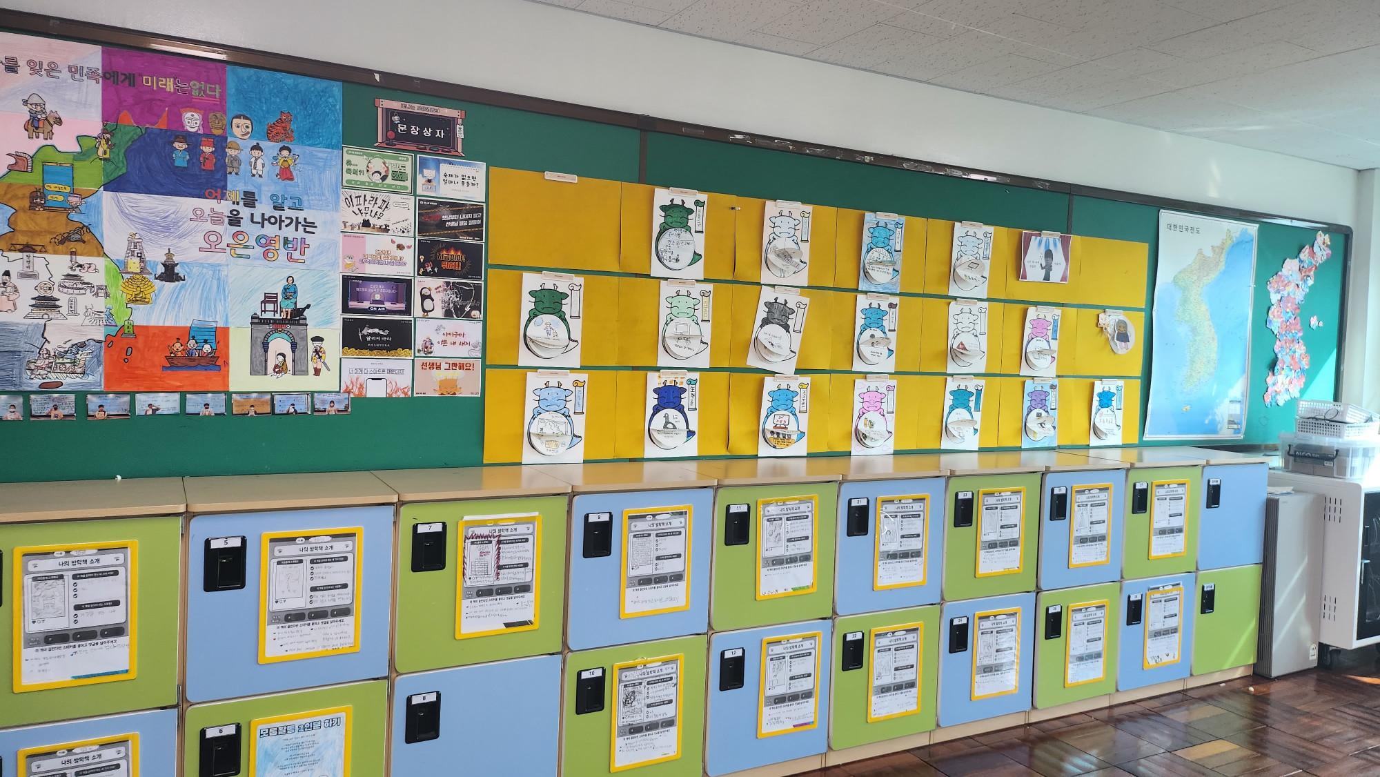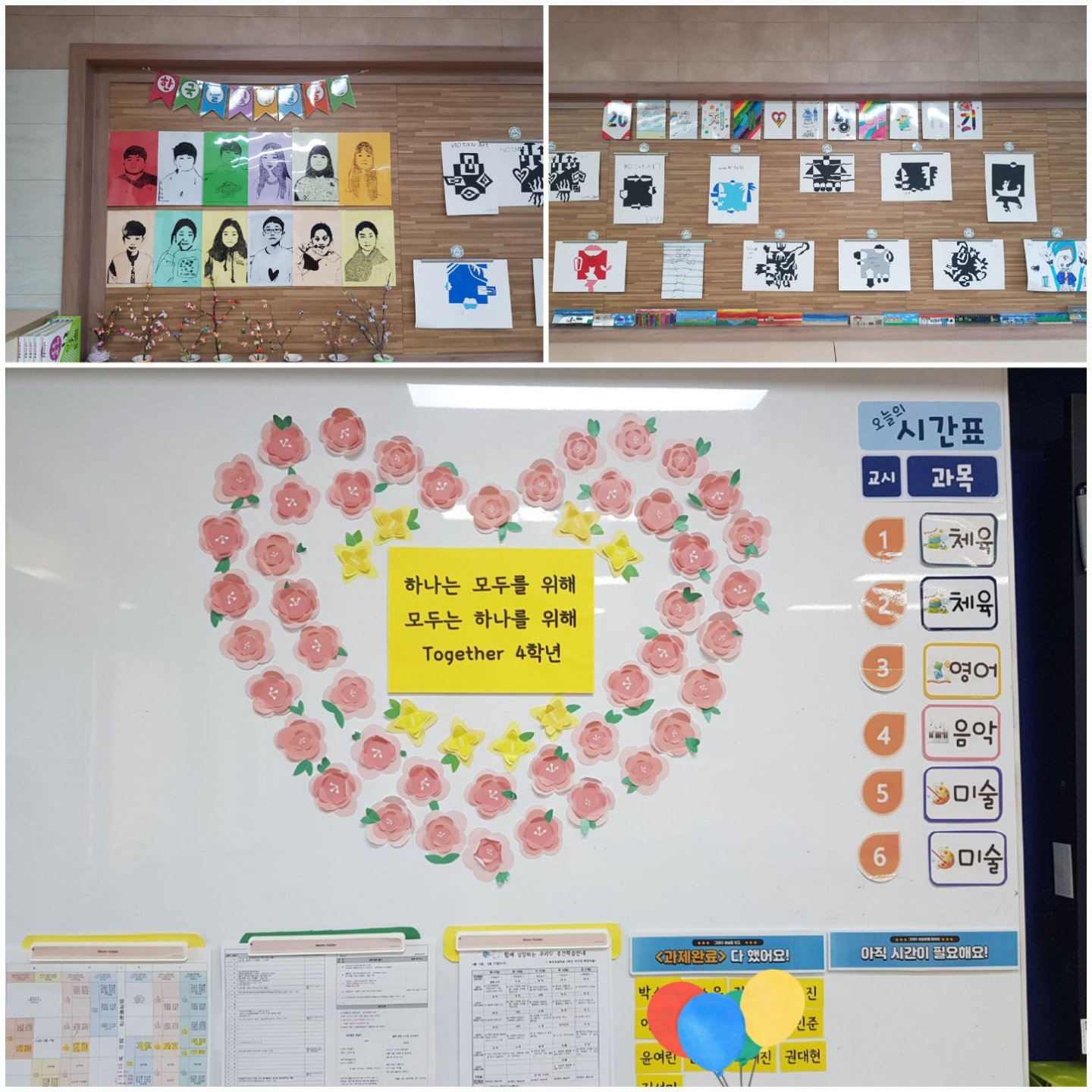 저는 아이들별로 대지를 하나씩 주고 뒷판엔 저렇게 작품을 하나씩 만들때마다 바꾸는 편입니다! 그러면 아주 깔끔한 뒷판이 나오기 때문에 저는 늘 이렇게 교실을 꾸미고 있습니다.