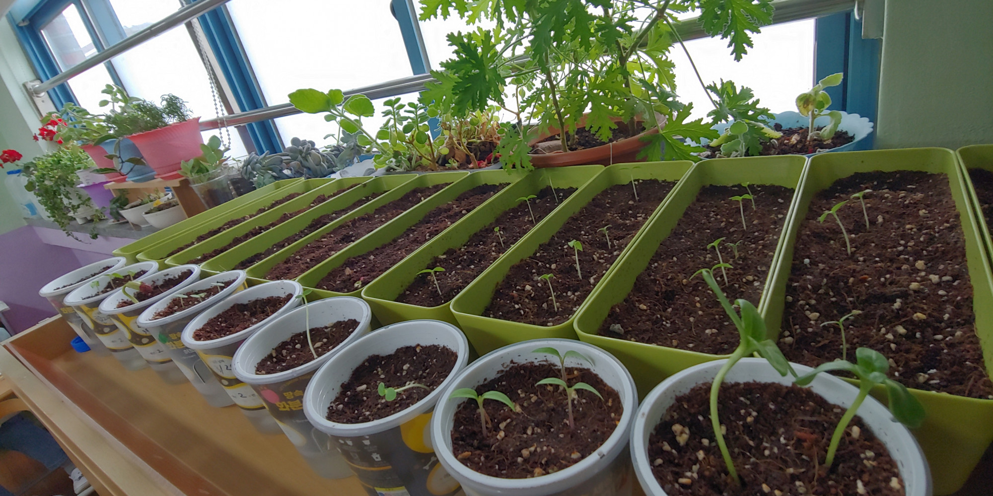 3월 말에 식목일 맞이 씨앗심기를 해서 요새 쑥쑥 새싹이 돋고 있어요.