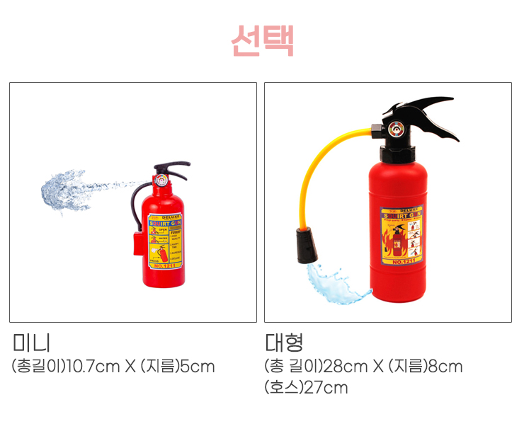 | 크기, 중량 | 미니 : (총길이)10.7cm X (지름)5cm / 대형 : (총 길이)28cm X (지름)8cm / (호스)27cm / 1kg 내외 |