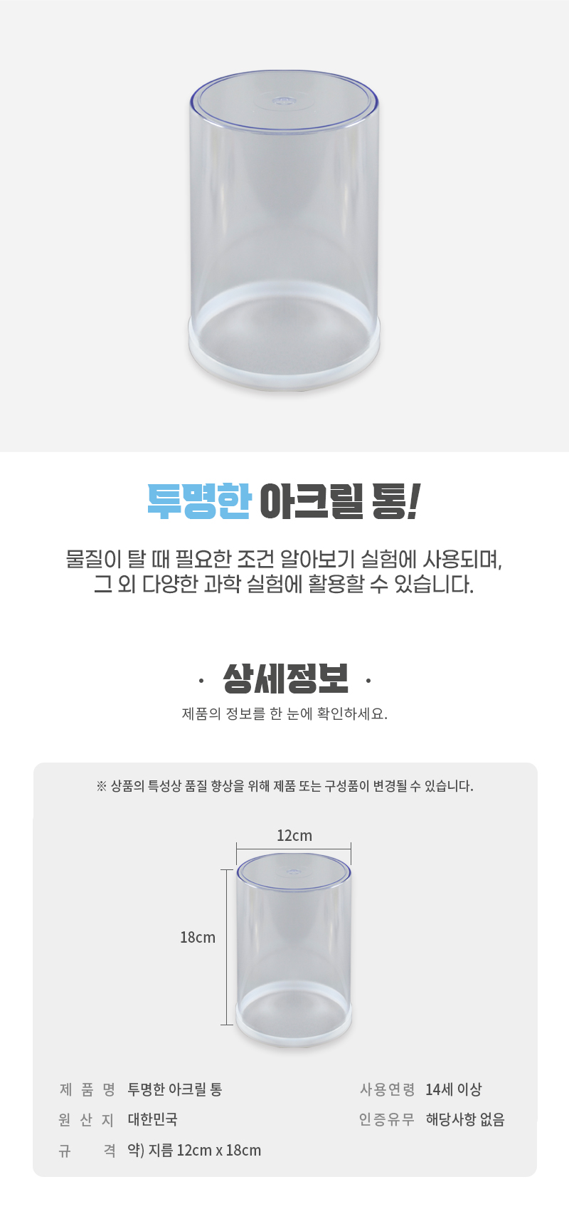 | 품명 및 모델명 | [와니사이언스] 투명한 아크릴 통(지름12* 18cm, 실리콘부) |