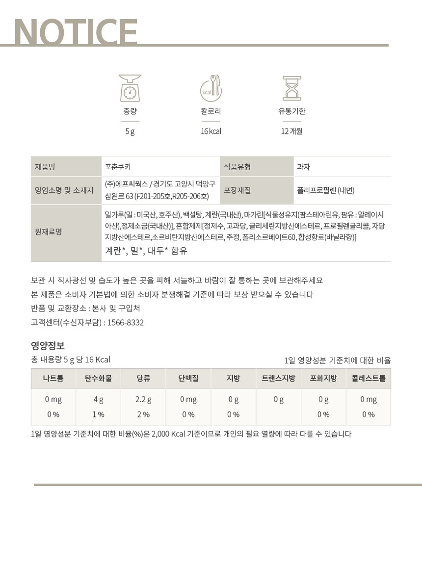 | 포장단위별 내용물의 용량(중량), 수량 | 5g(16kcal,1개입) |