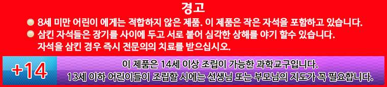 | 취급방법 및 취급시 주의사항, 안전표시 (주의, 경고 등) | 8세 미만 어린이에게 적합하지 않은 제품입니다. 이 제품은 작은 자석을 포함하고 있습니다. 삼킨 자석들은 장기를 사이에 두고 서로 붙어 심각한 상해를 야기할 수 있습니다. 자석을 삼킨 경우, 즉시 전문의의 치료를 받으십시요. 이 제품은 선생님 또는 부모님의 지도가 필요한 14세이상 조립이 가능한 과학 및 코딩교육용 교구입니다. |