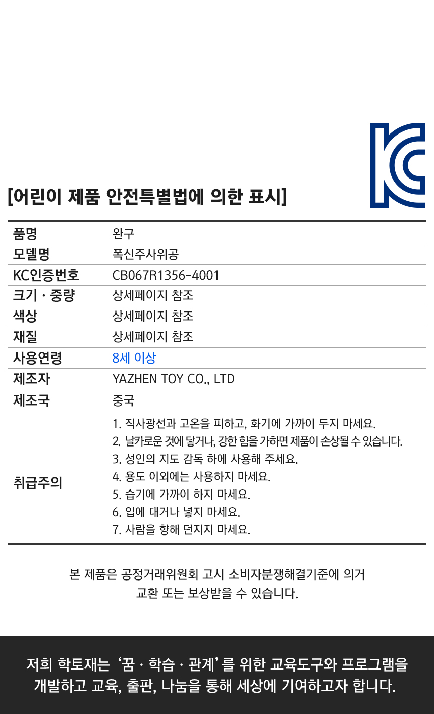 | 취급방법 및 취급시 주의사항, 안전표시 (주의, 경고 등) | 1. 직사광선과 고온을 피하고, 화기에 가까이 두지 마세요. 2. 날카로운 것에 닿거나, 강한 힘을 가하면 제품이 손상될 수 있습니다. 3. 성인의 지도 감독 하에 사용해 주세요. 4. 용도 이외에는 사용하지 마세요. 5. 습기에 가까이 하지 마세요. 6. 입에 대거나 넣지 마세요. 7. 사람을 향해 던지지 마세요. |