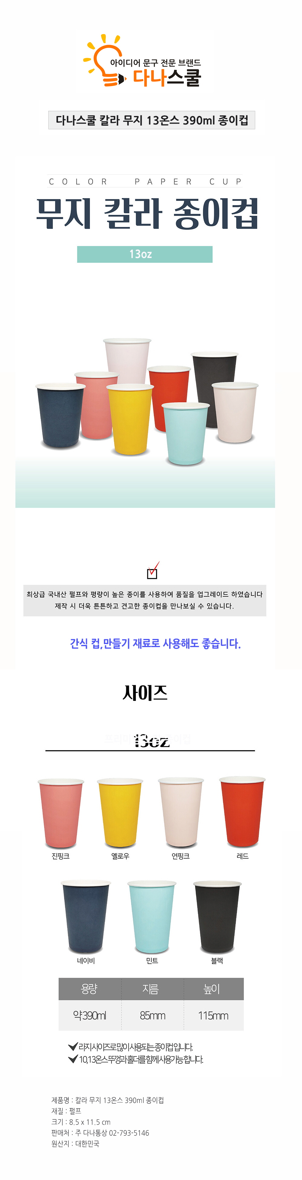 | 품명 및 모델명 | [다나스쿨] 국산 식음용 13온스 390ml 무형광 천연펄프 칼라 종이컵 10개 |