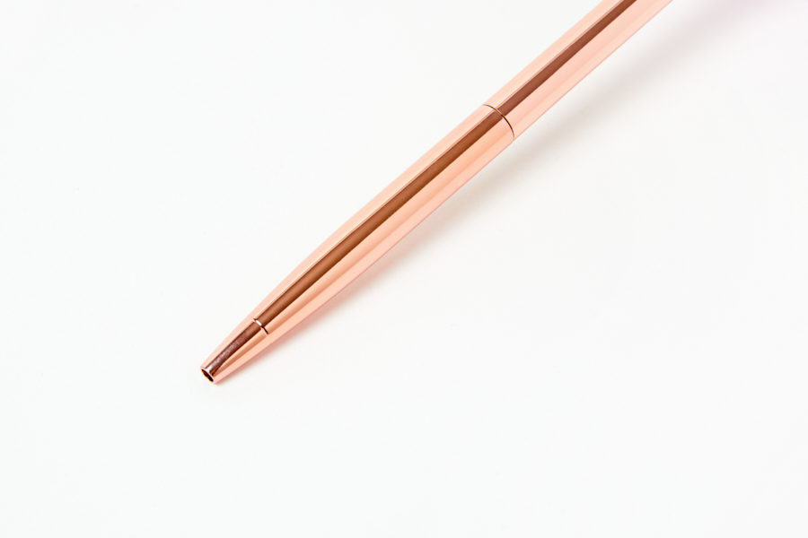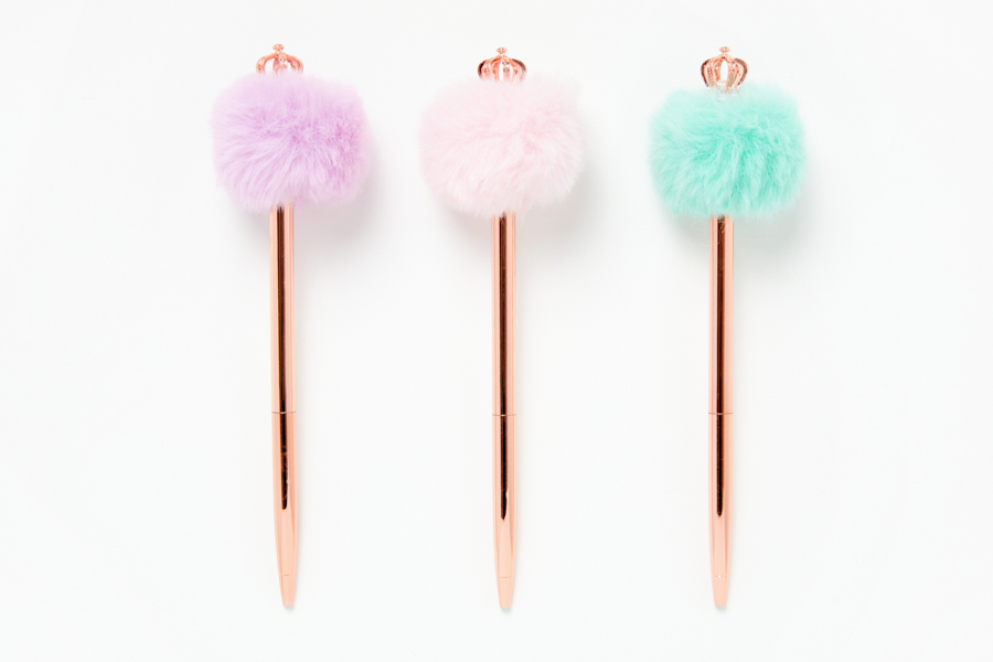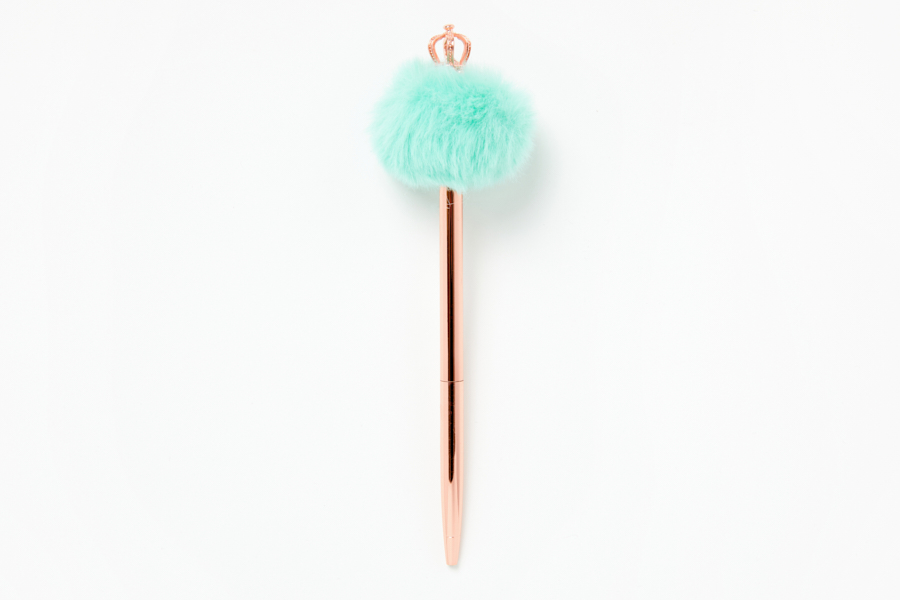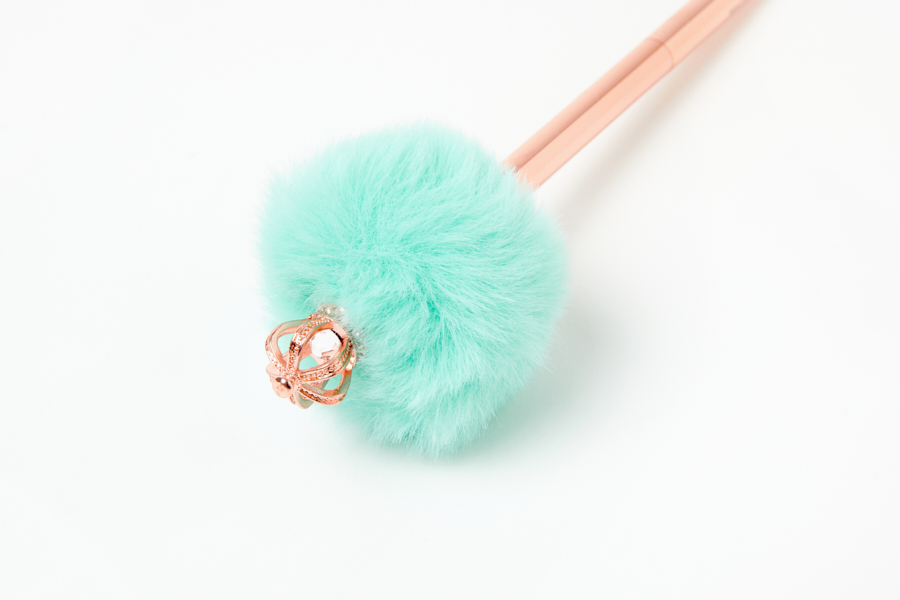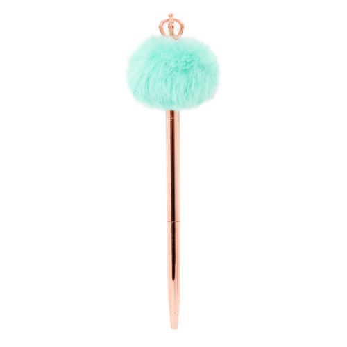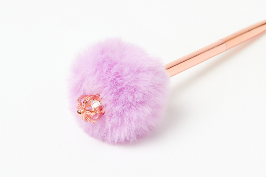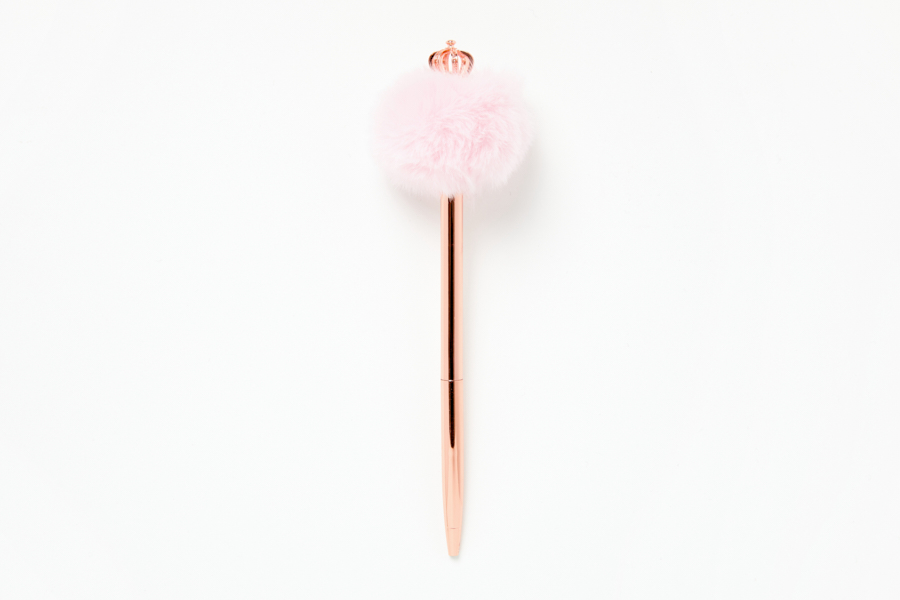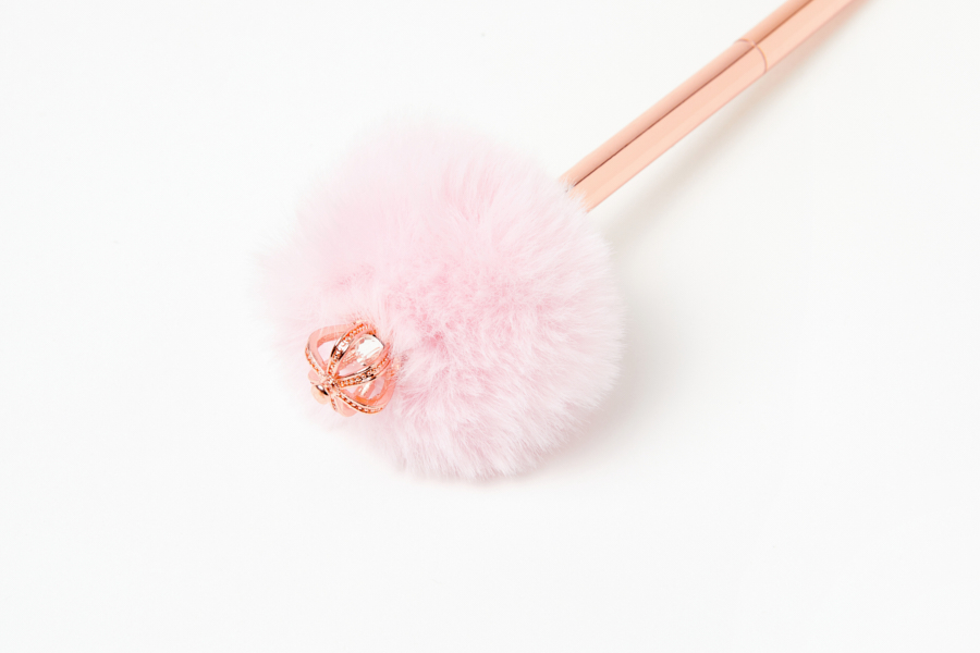 부드러운 폼폼이 위에 왕관이 달려있는 로즈골드 펜입니다.
