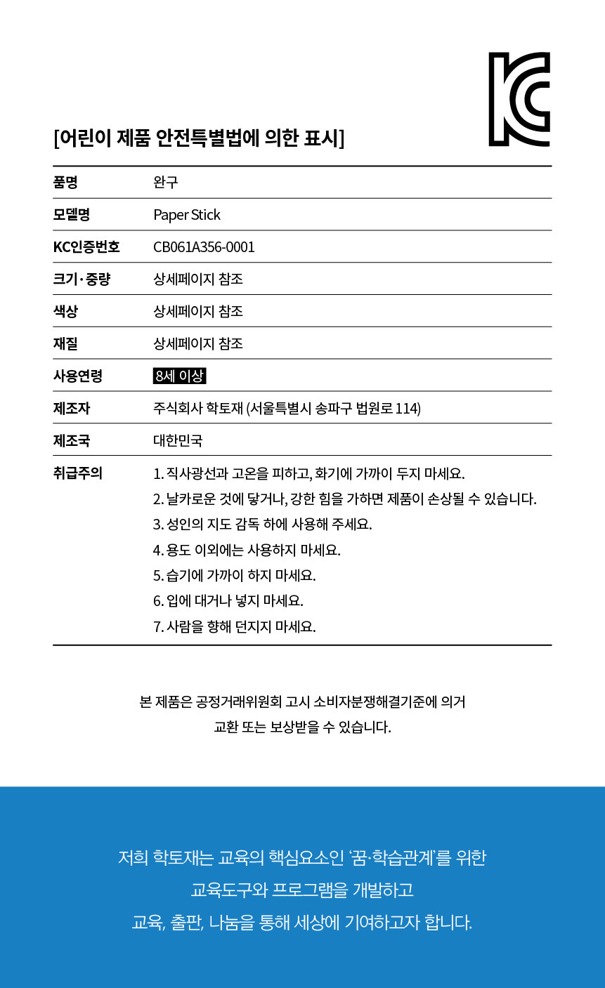 | 품질보증기준 | 1. 직사광선과 고온을 피하고, 화기에 가까이 두지 마세요. 2. 날카로운 것에 닿거나, 강한 힘을 가하면 제품이 손상될 수 있습니다. 3. 성인의 지도 감독 하에 사용해 주세요. 4. 용도 이외에는 사용하지 마세요. 5. 습기에 가까이 하지 마세요. 6. 입에 대거나 넣지 마세요. 7. 사람을 향해 던지지 마세요. |