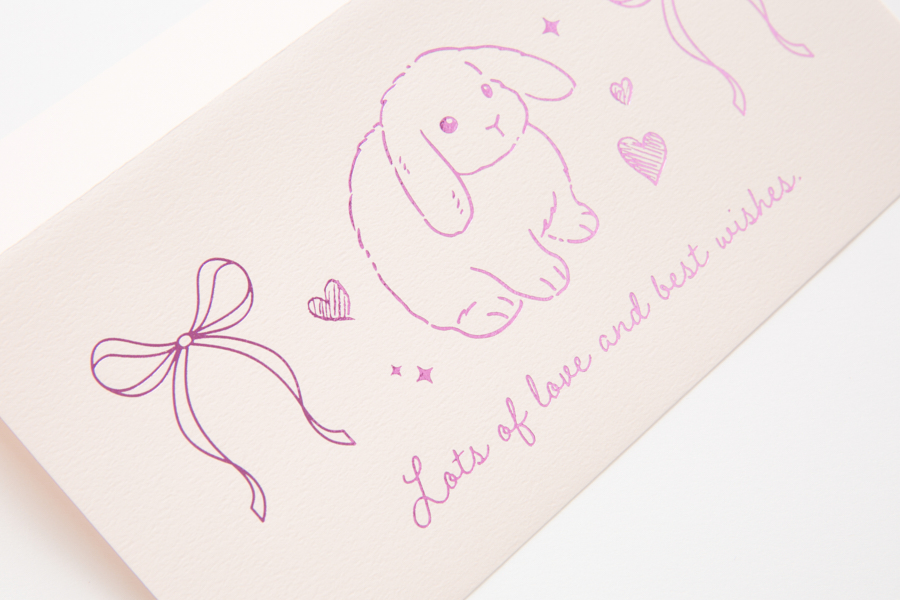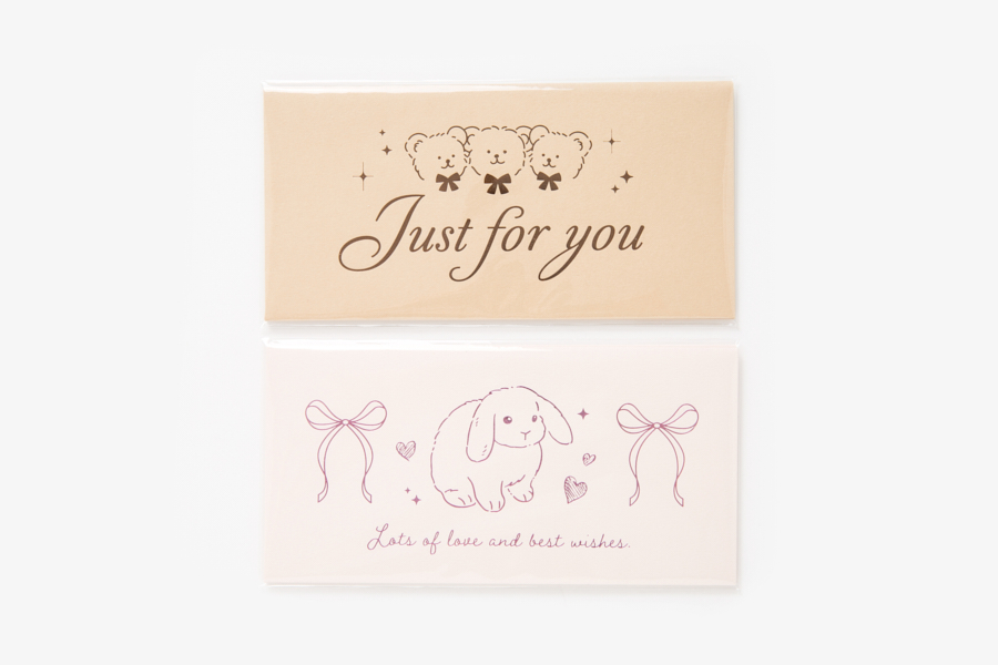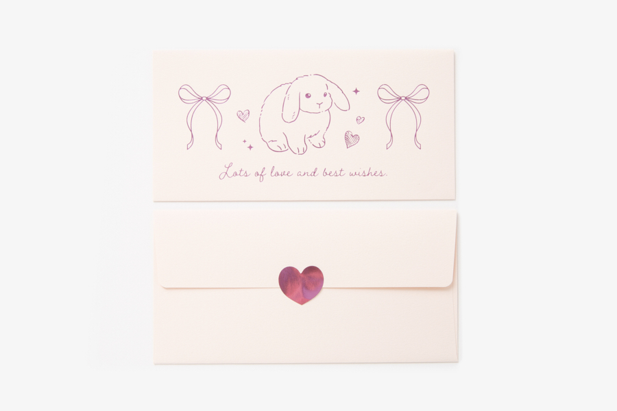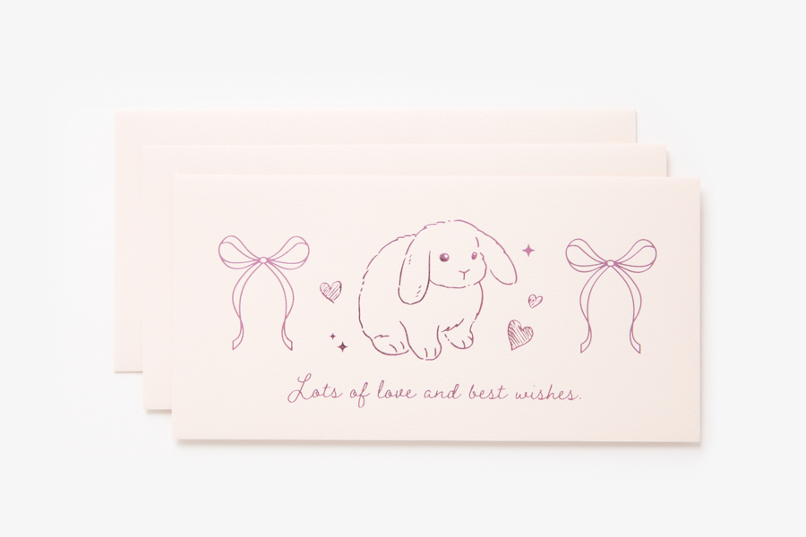 러블리한 토끼, 리본 일러스트와 레터링이 어우러진 박가공 봉투입니다.