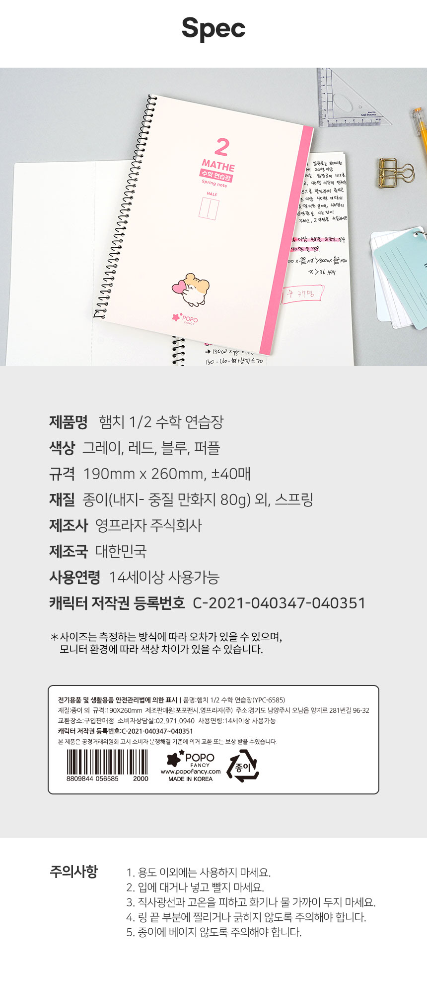 | 품명 및 모델명 | 2000 햄치2분할수학연습장 |