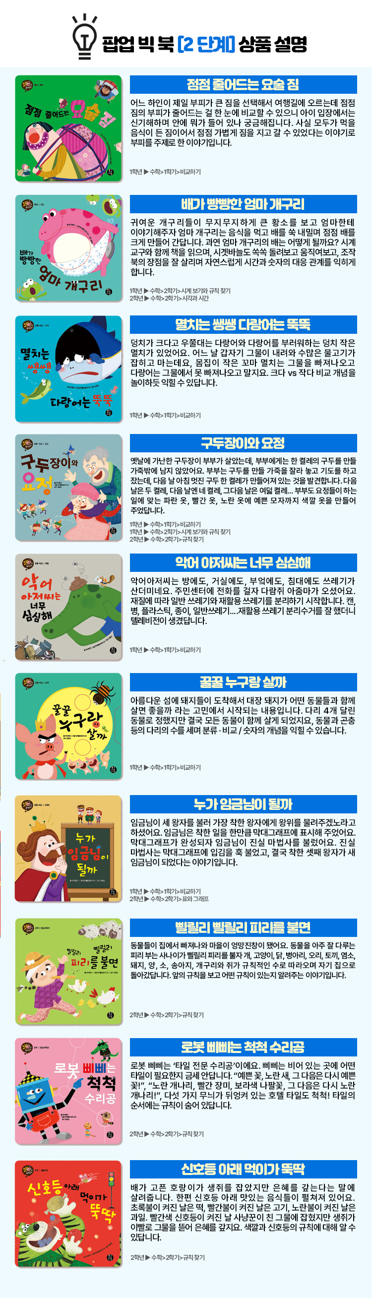 | 도서명 | 맛있는 수학동화 빅북 2단계 (팝업 빅북 10권+워크시트 10종+스티커북1종) |