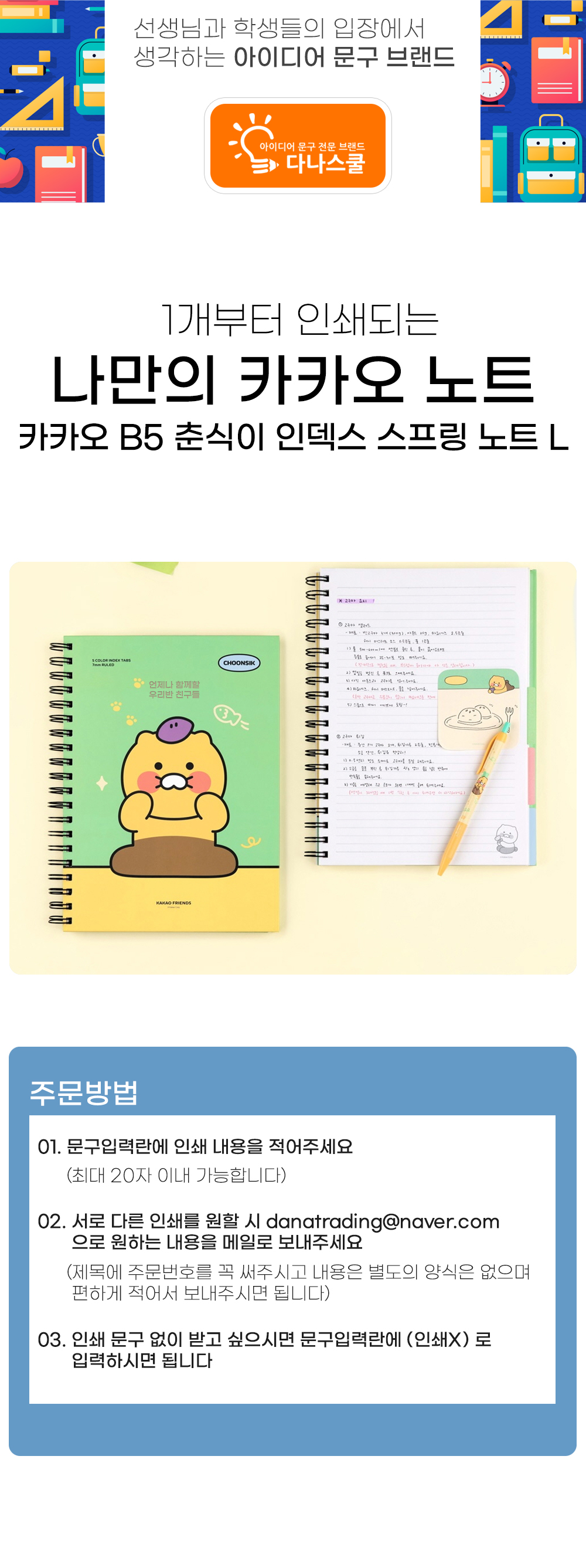 | 품명 및 모델명 | [카카오프렌즈] 1개부터 무료인쇄 + 카카오 B5 춘식이 인덱스 스프링 노트 L |