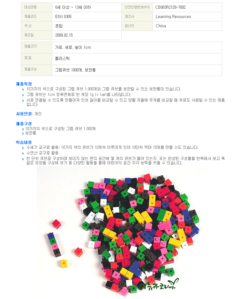 | 품명 및 모델명 | 그램 큐브 Interlocking Centimeter Cubes (1,000개) |