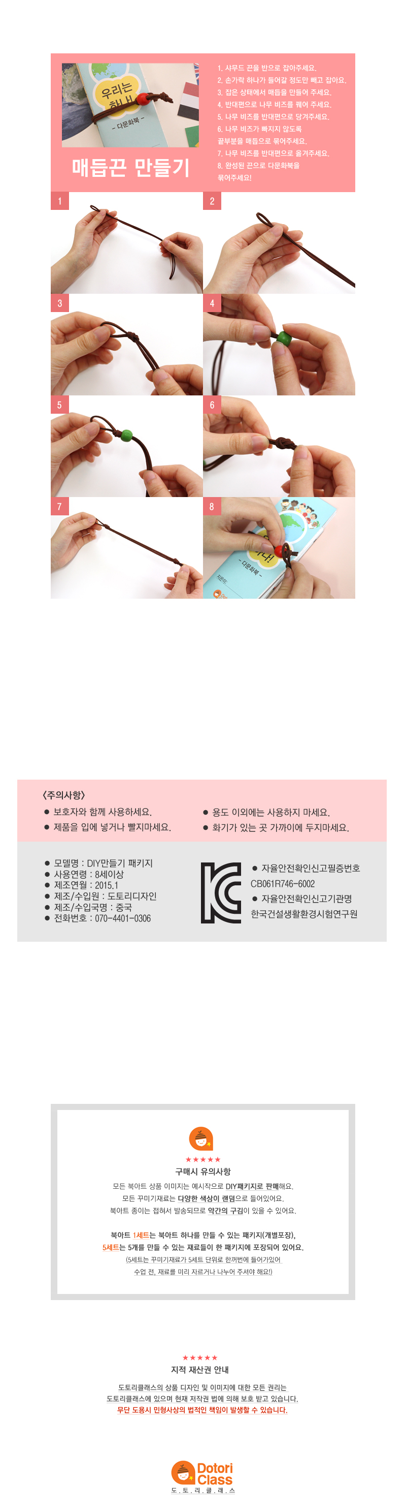 | 구성 | 샤무드끈50cm, 플라워리본5cm, 체크리본15cm, 골드리본15cm, 나무비즈1개, 꽃스팡클2개, 펠트꽃4개, 두꺼운 내용페이지2장, 나라설명페이지2장, 설명서 |