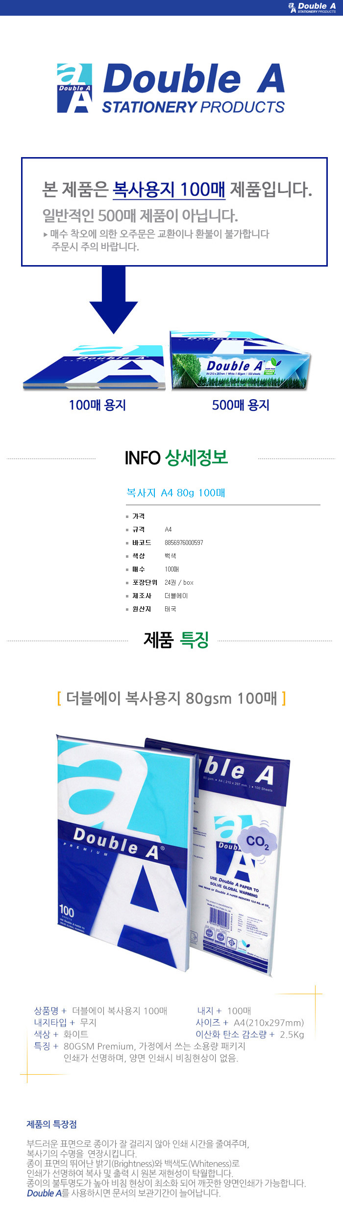 | 품명 및 모델명 | [더블에이] 복사용지 A4 80g / 100매 |
