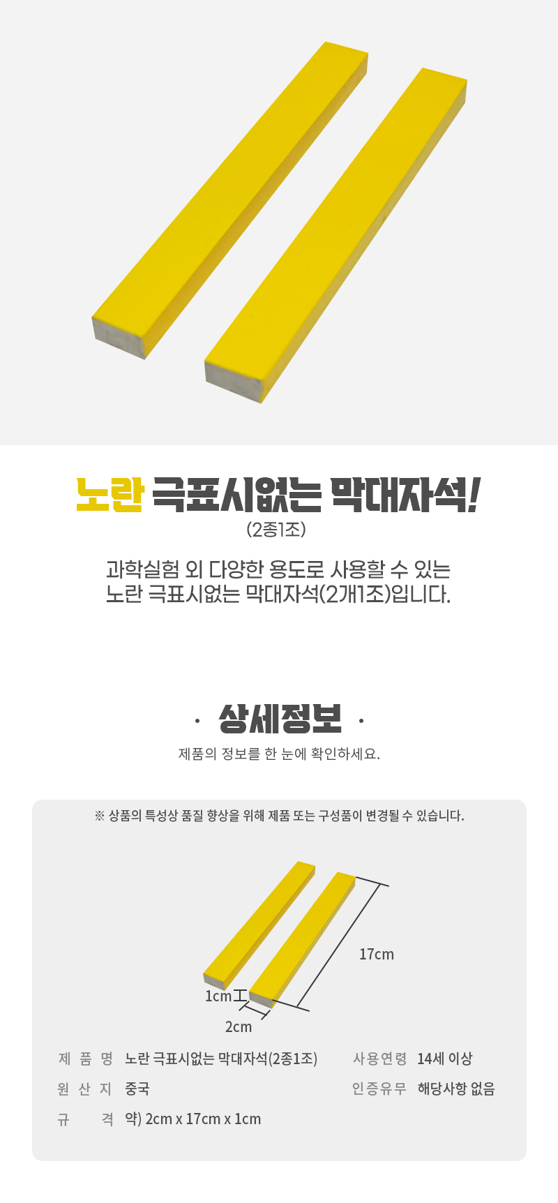 | 품명 및 모델명 | [와니사이언스] 노란 극표시없는 막대자석(2종1조) |