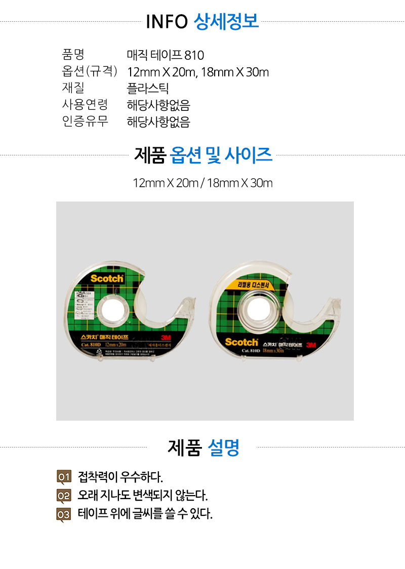 | 기타 | 붙인 자국이 없고 복사해도 표시가 나지않는 매직테이프와, 우수한 접착력의 다용도 테이프로 깔끔하게 자료를 스크랩하고 다양하게 활용해 보세요. |