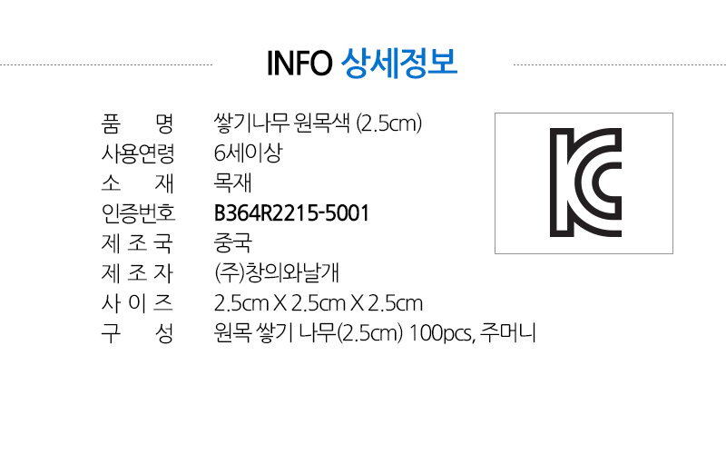 | 품명 및 모델명 | [네모세모] 쌓기나무 원목색(2.5cm 100pcs) - 주머니포함 |