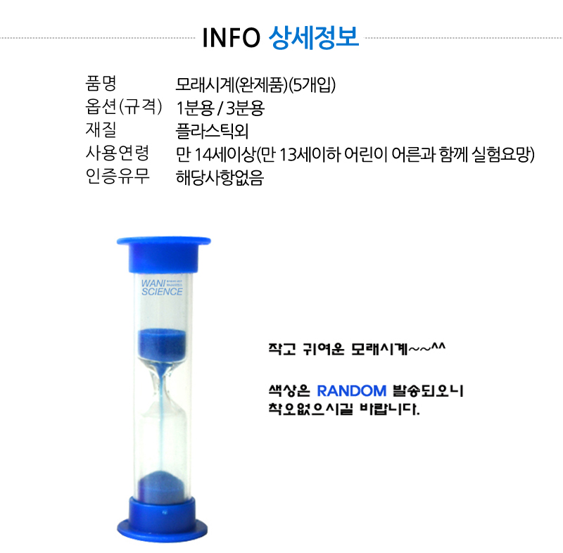 | 품명 및 모델명 | [와니사이언스] 모래시계(5개입,완제품) WN-1280 |