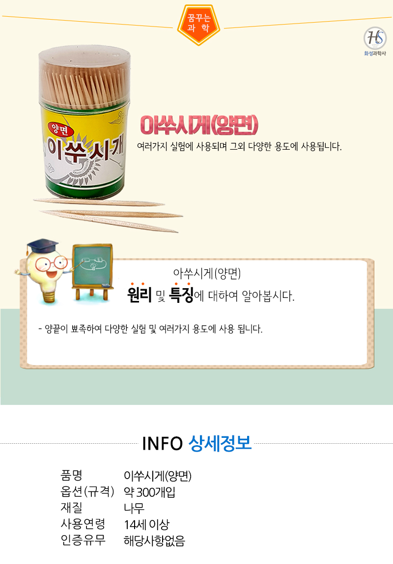| 취급방법 및 취급시 주의사항, 안전표시 (주의, 경고 등) | 1.끝이 날카로우니 사용시 주의 하세요, 2. 실험용으로만 사용하세요 3. 만13세이하 어린이는 보호자와 함께 실험해주세요 |