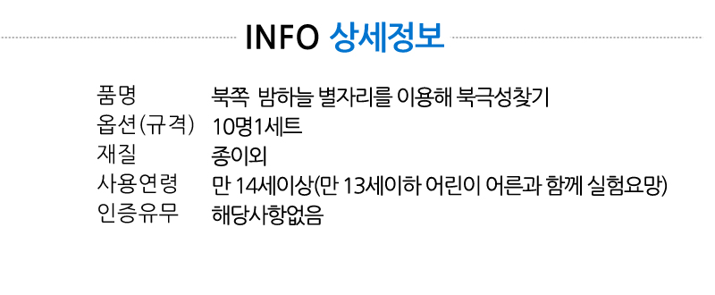 | 품명 및 모델명 | [와니사이언스] 북쪽 밤하늘 별자리를 이용해 북극성찾기(10명1세트) WN-5190 |