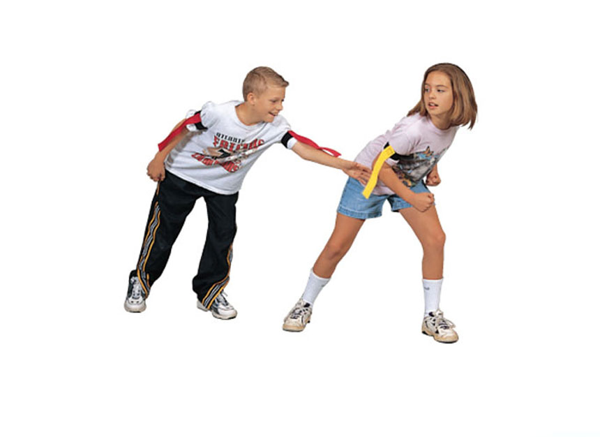 팔에 벨크로 벨트를 착용하고 깃발을 붙여 서로 떼어내는 술래잡기형 게임을 할 수 있습니다.