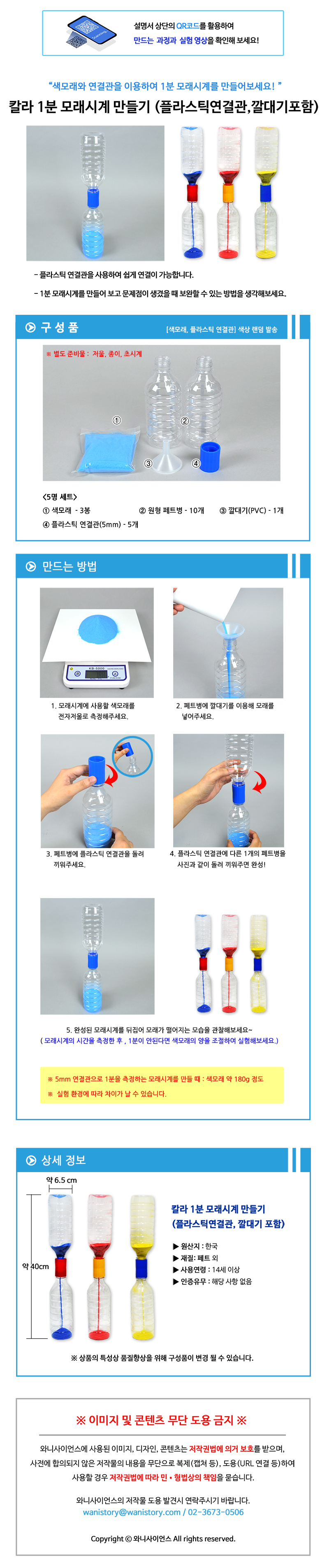 | 품명 및 모델명 | [와니사이언스] 칼라1분 모래시계만들기 (플라스틱연결관,깔대기포함) (5명 세트) |