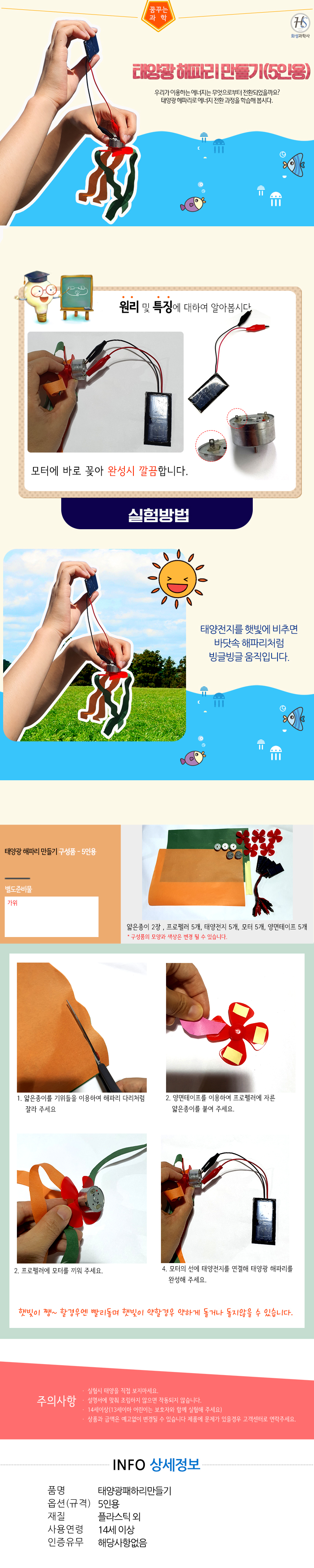 | 취급방법 및 취급시 주의사항, 안전표시 (주의, 경고 등) | 1.태양광 셀을 연결시 과도하게 당기면 전선이 끊어 질 수 있습니다. 2.작은부품은 삼킬 수 있으므로 주의해주세요. 3. 화기에 주의해주세요 4.실험용으로만 사용해주세요 5. 만13세 이하 어린이는 보호자와 함께 사용해주세요. |