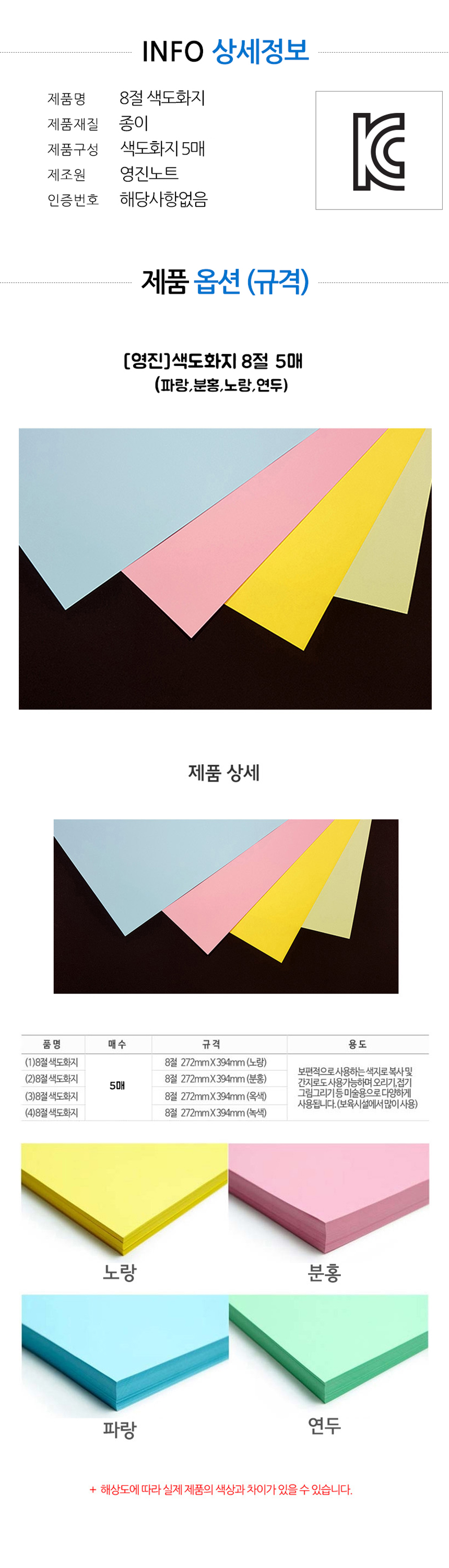 | 품명 및 모델명 | [영진] 색도화지 8절 5매(색상선택) |
