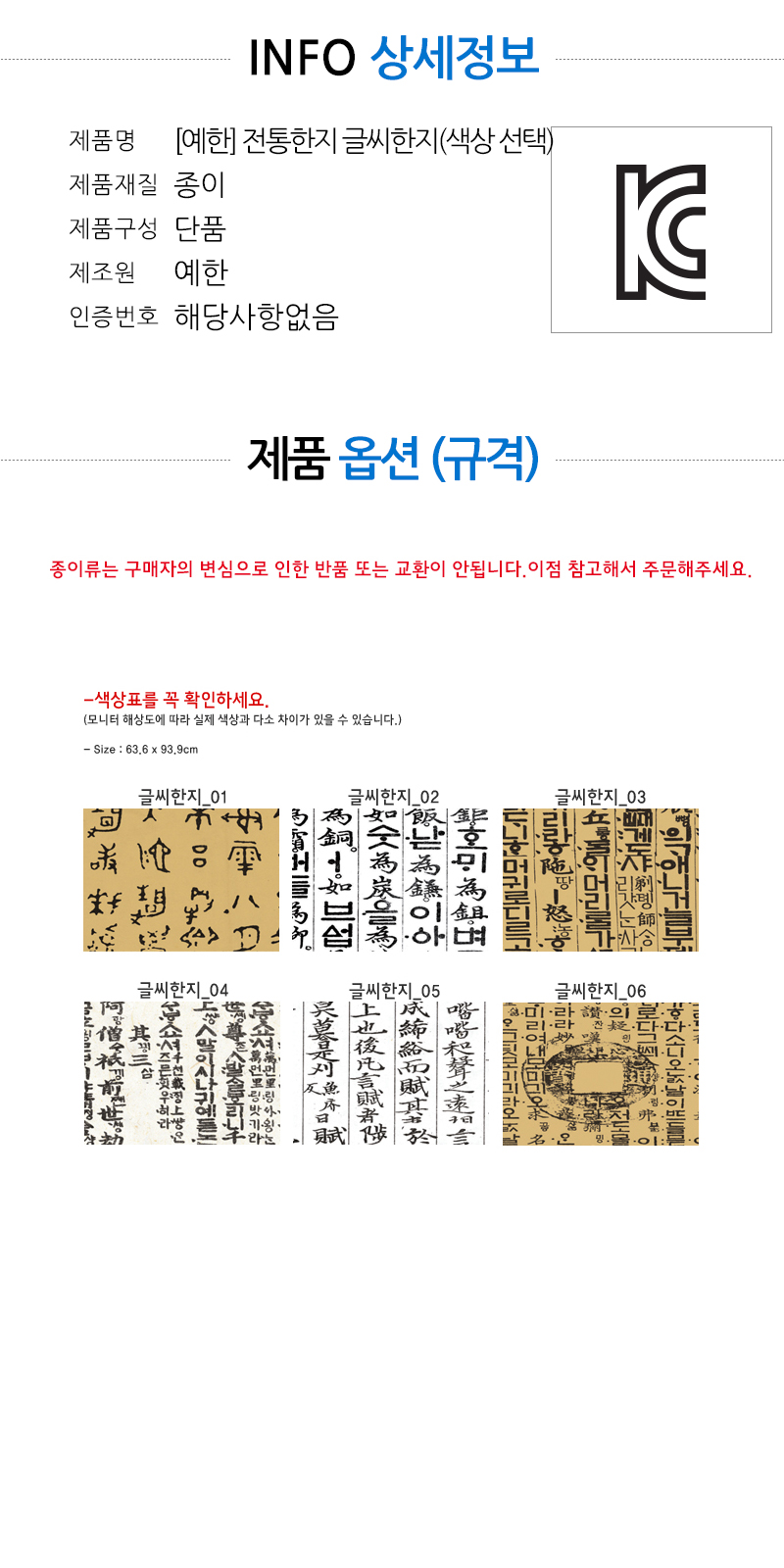 | 품명 및 모델명 | [예한] 전통한지 글씨한지(색상 선택) |
