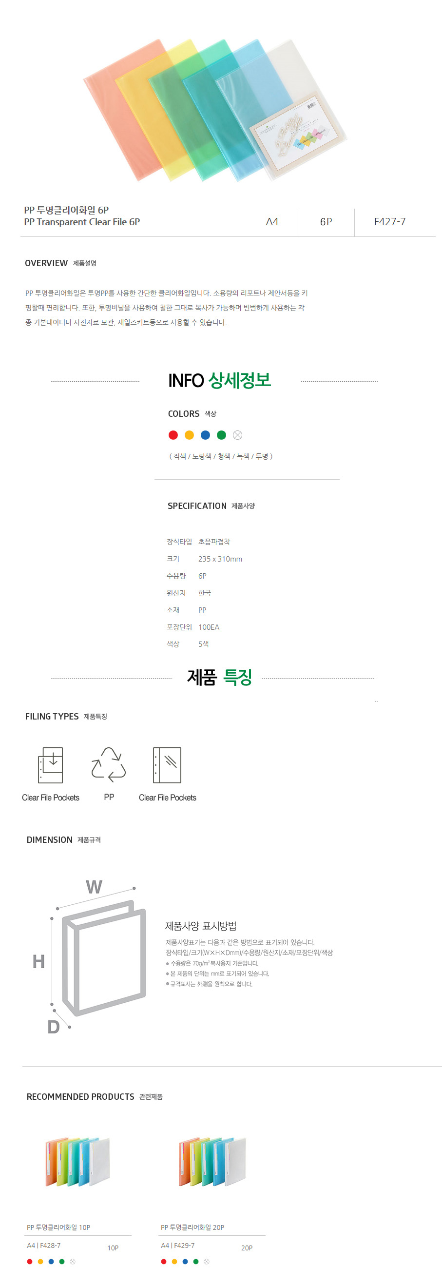 | 품명 및 모델명 | F427-7 투명 P.P 클리어 파일 6매 |
