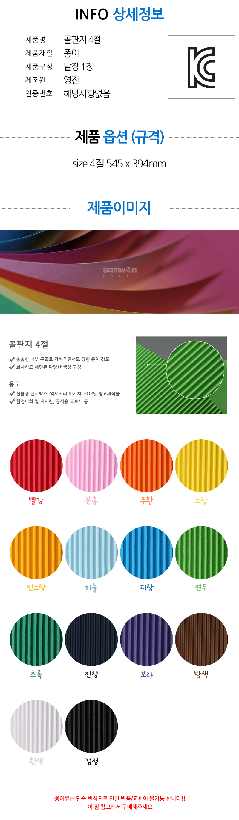 | 색상 | 흰색/진노랑/노랑/밤색/주황/분홍/진청색/검정/보라/하늘/파랑색/빨강/연두/초록 |