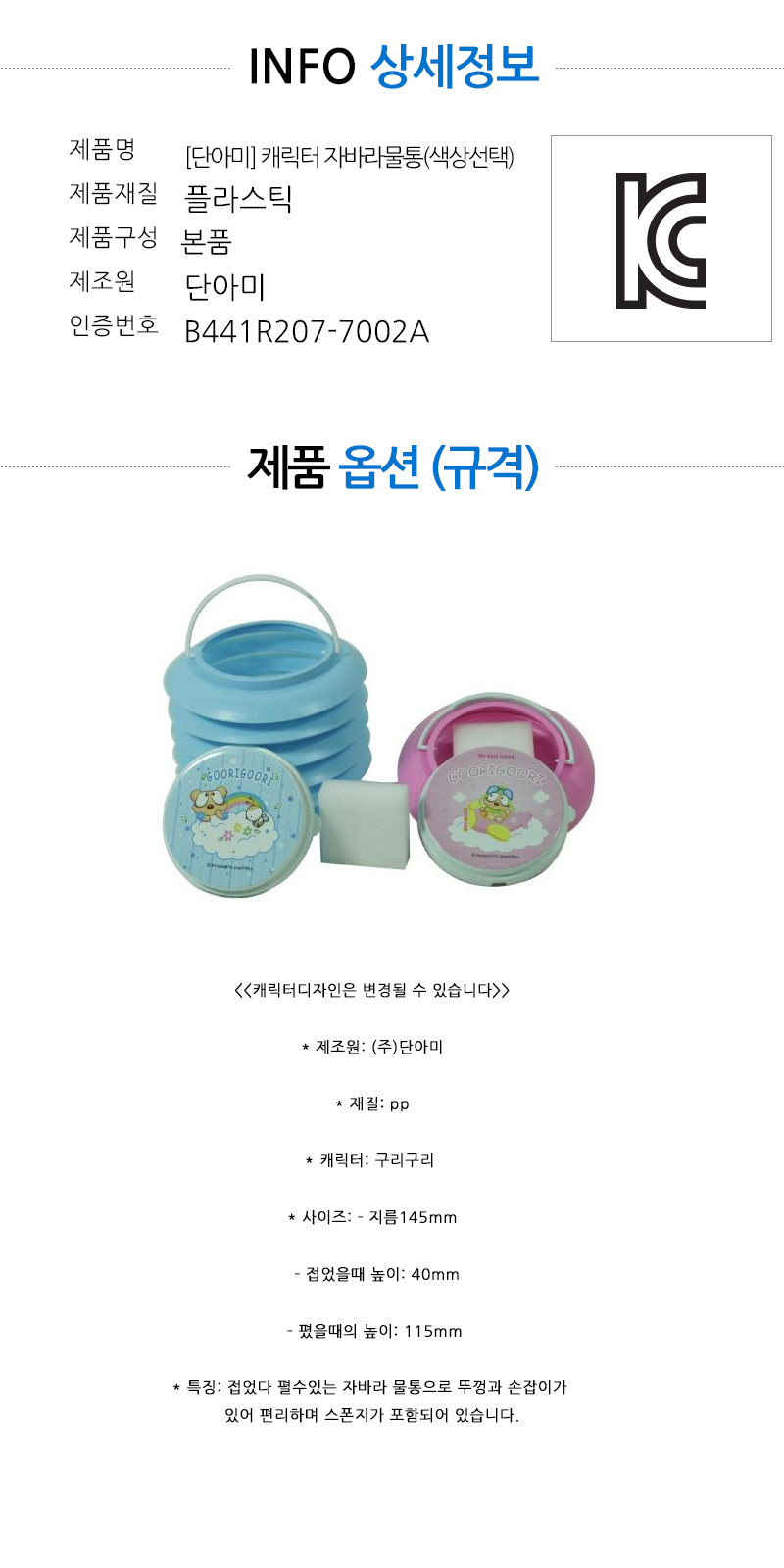 | 품명 및 모델명 | [단아미] 캐릭터 자바라물통(색상선택) |