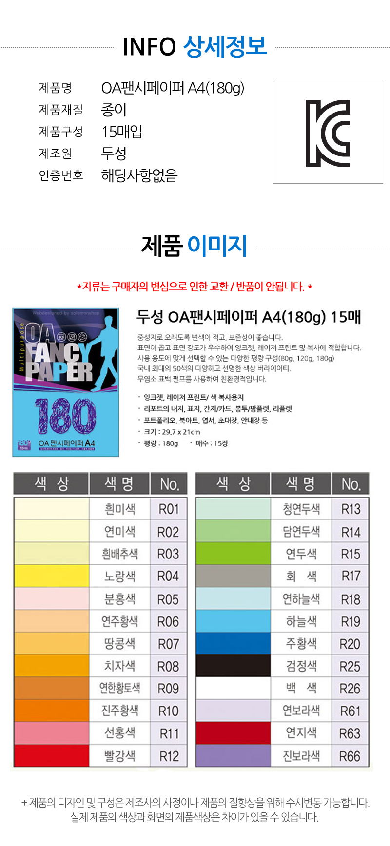 | 품명 및 모델명 | [두성] OA팬시페이퍼 A4(180g) 15매(색상선택) |