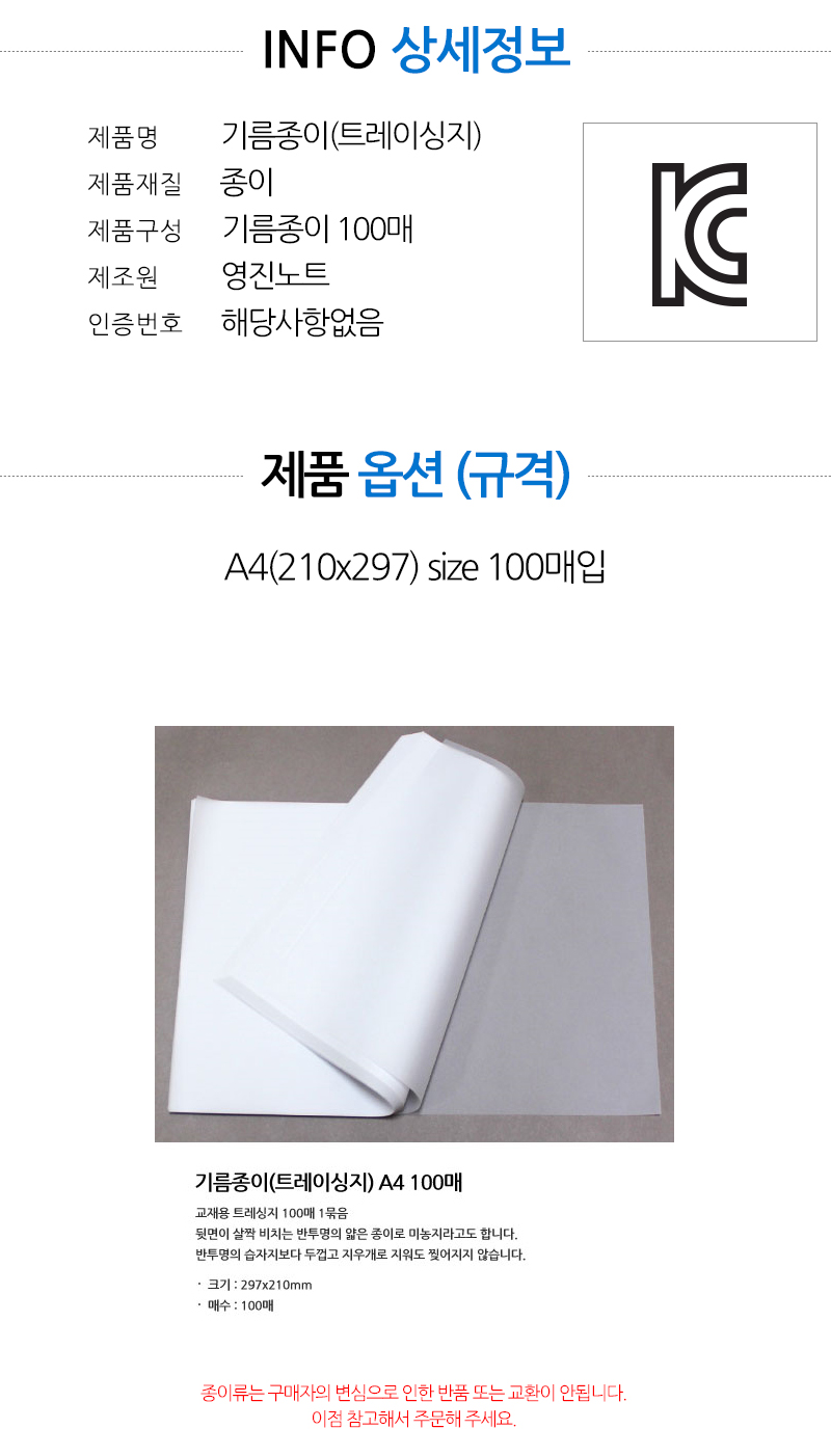 | 품명 및 모델명 | [영진] 기름종이(트레이싱지) A4 100매 |