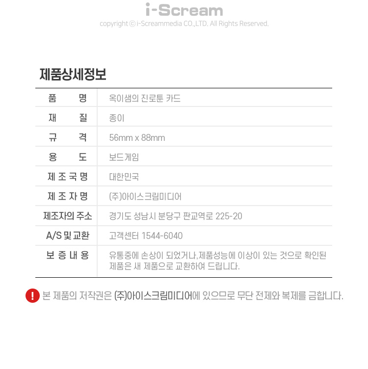 | 품명 및 모델명 | [아이스크림] 옥이샘의 진로툰 카드 (직업카드/보드게임) |