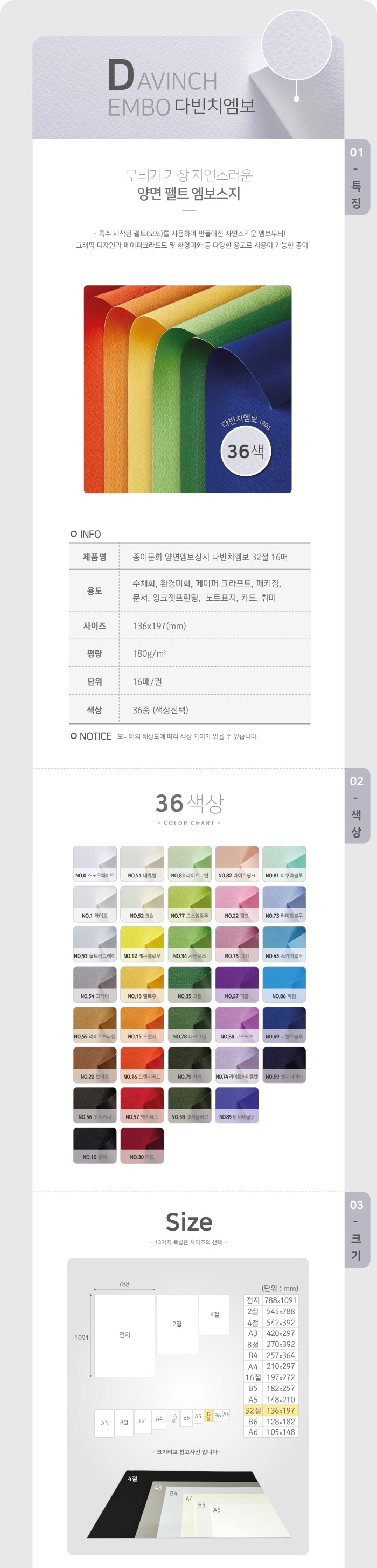 | 품명 및 모델명 | [종이문화] 양면펠트 머메이드지 다빈치엠보 32 절 16 매 (34색 택1) |
