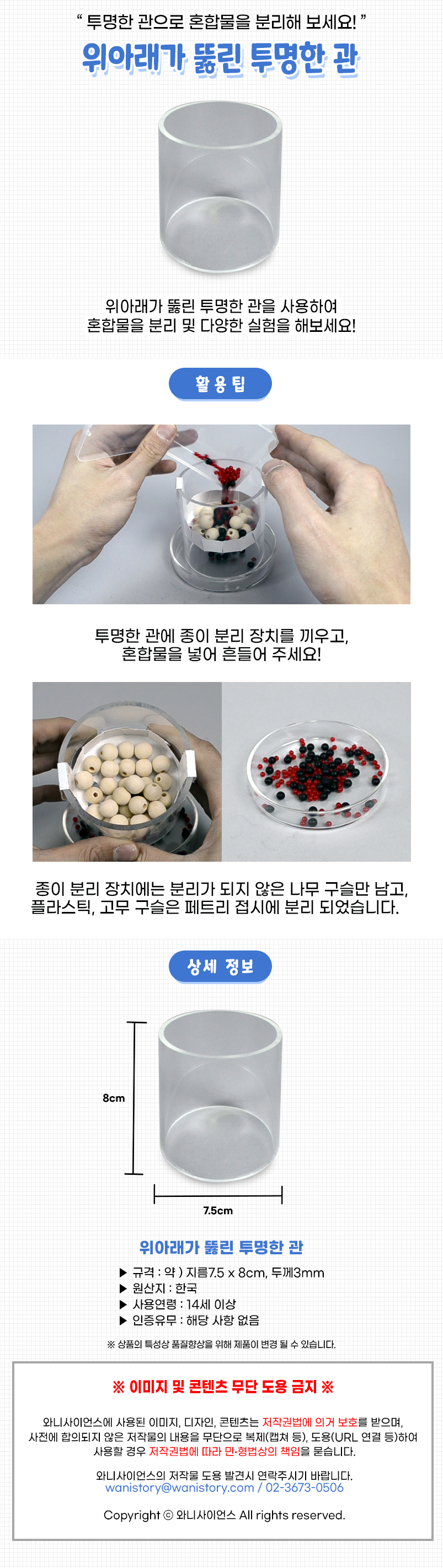 | 품명 및 모델명 | [와니사이언스] 위아래가 뚫린 투명한관(지름75*80mm, 두께3mm)(천재) |