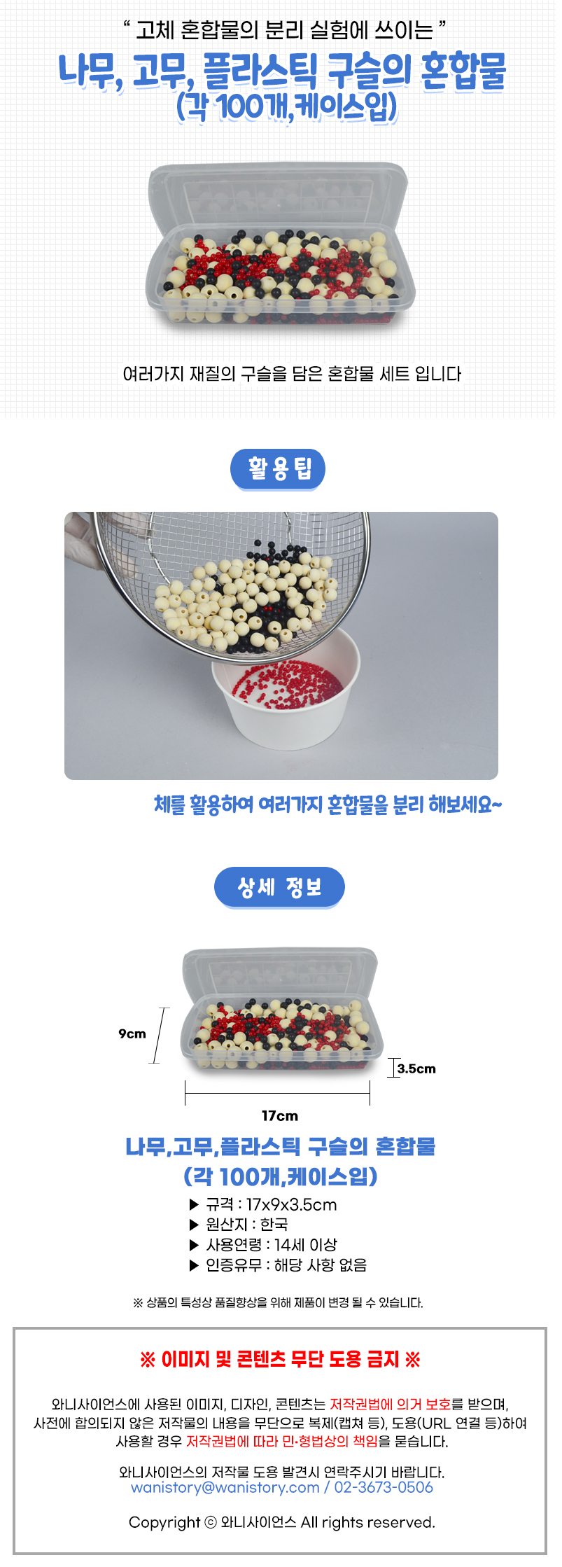 | 품명 및 모델명 | [와니사이언스] 나무,고무,플라스틱 구슬의 혼합물(각100개,케이스입)(천재) |