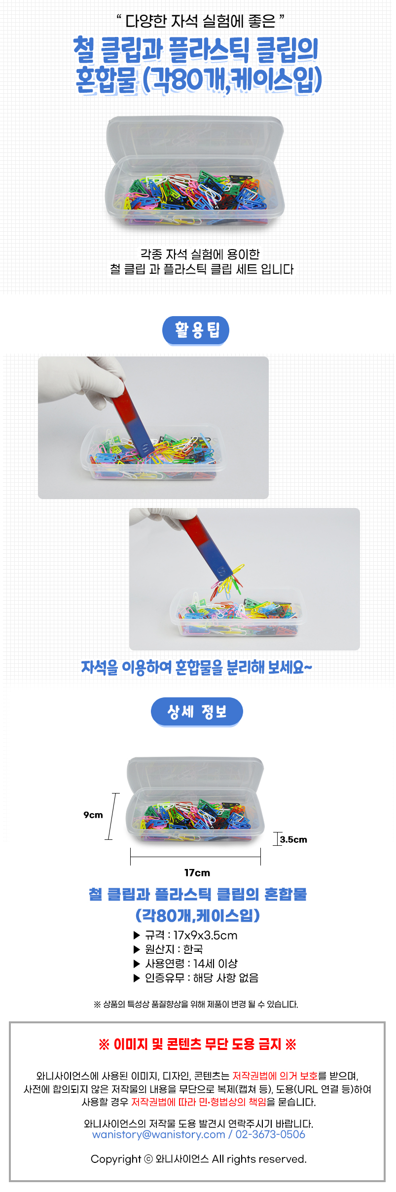 | 품명 및 모델명 | [와니사이언스] 철 클립과 플라스틱 클립의혼합물(각80개, 케이스입)(김영사) |
