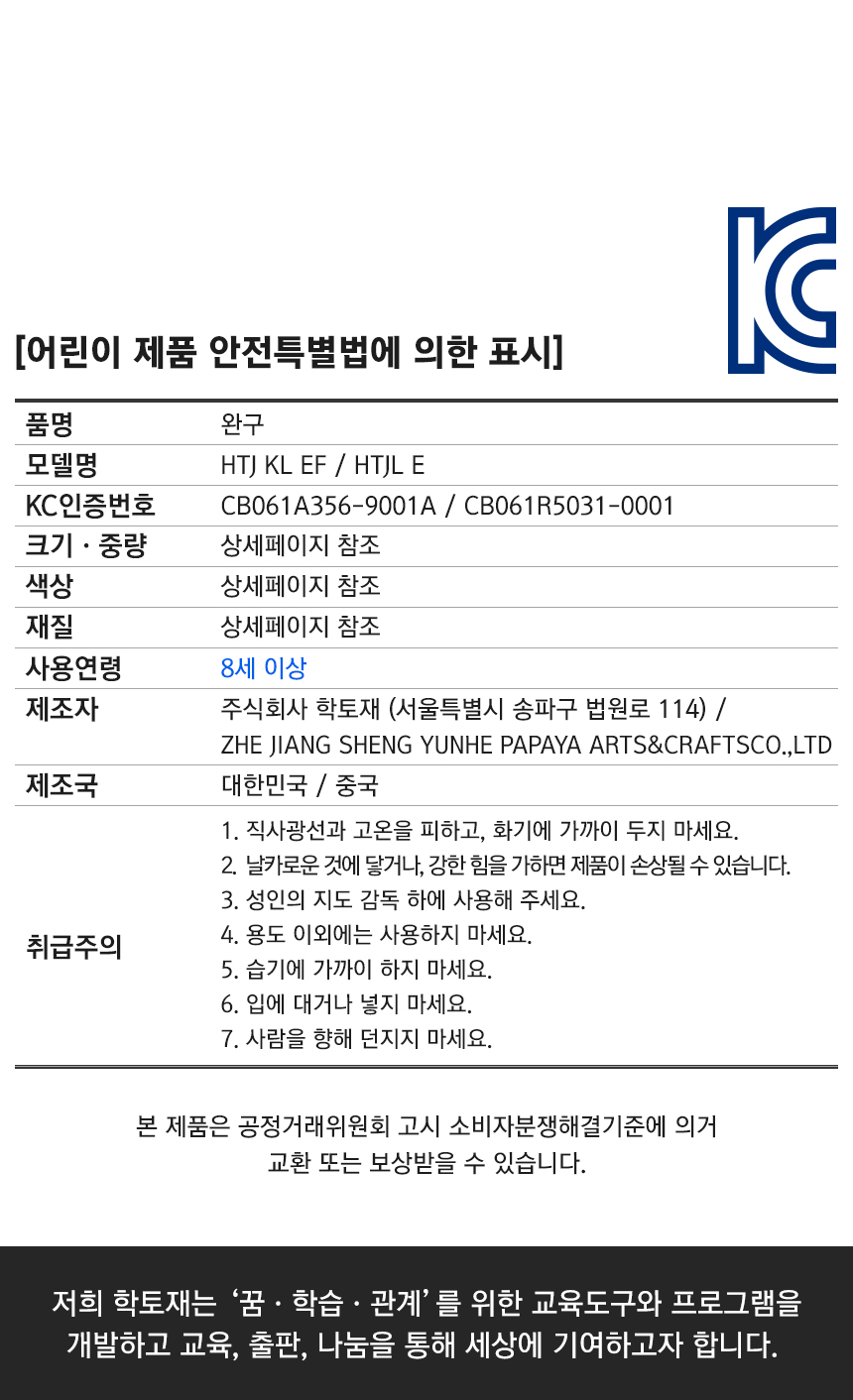 | 취급방법 및 취급시 주의사항, 안전표시 | 1. 직사광선과 고온을 피하고, 화기에 가까이 두지 마세요. 2. 날카로운 것에 닿거나, 강한 힘을 가하면 제품이 손상될 수 있습니다. 3. 성인의 지도 감독 하에 사용해 주세요. 4. 용도 이외에는 사용하지 마세요. 5. 습기에 가까이 하지 마세요. 6. 입에 대거나 넣지 마세요. |