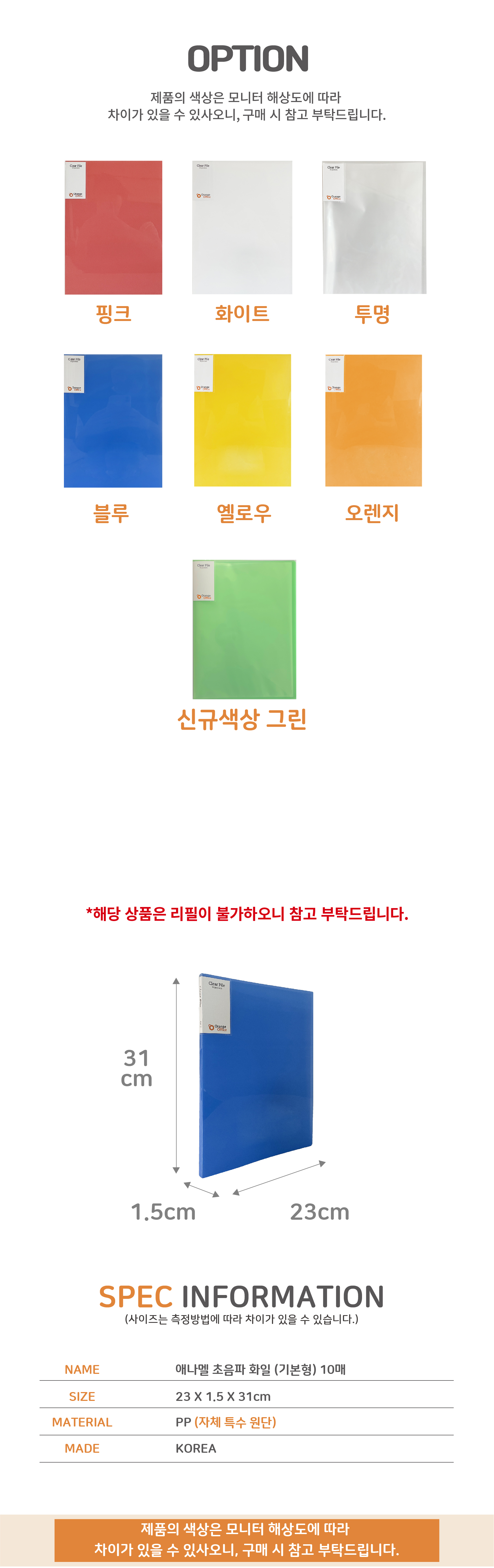 | 색상 | 투명, 화이트, 핑크, 블루, 옐로우, 주황, 그린 |