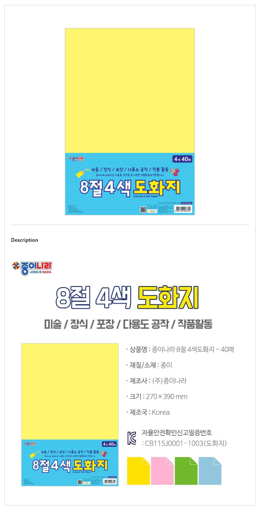 | 품명 및 모델명 | [종이나라 ] 8절 4색 도화지 40매 |