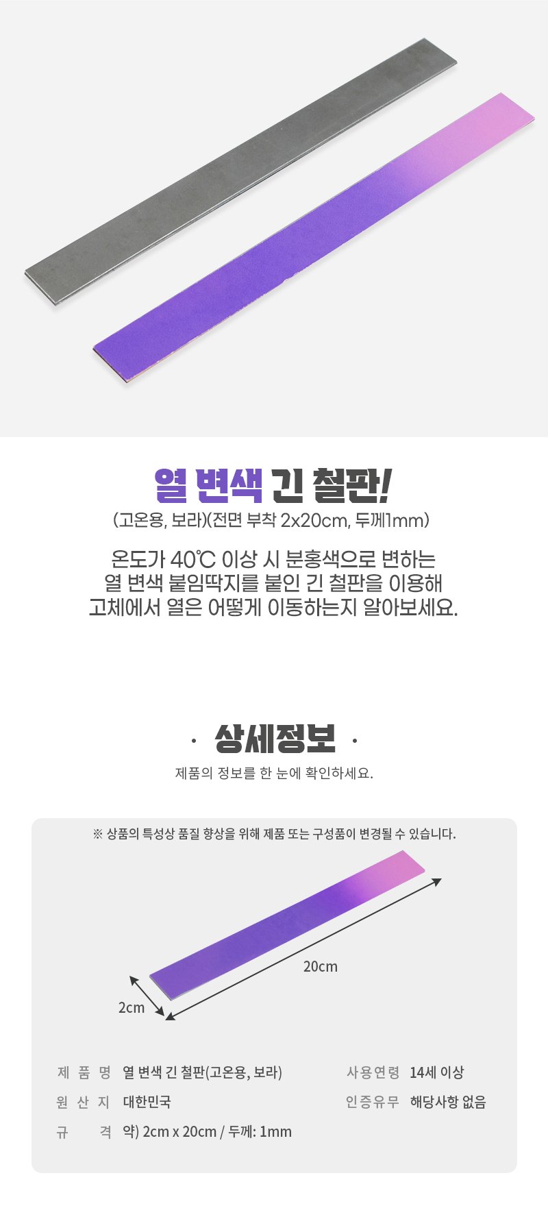 | 품명 및 모델명 | [와니사이언스]열 변색 긴 철판(고온용, 보라, 전면 부착, 2*20cm, 두께1mm)(천재) |