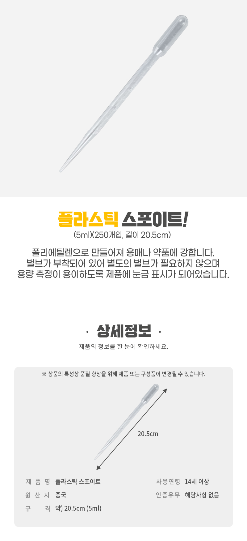 | 품명 및 모델명 | [와니사이언스] 플라스틱 스포이트(5ml)(250개입, 길이20.5cm) |