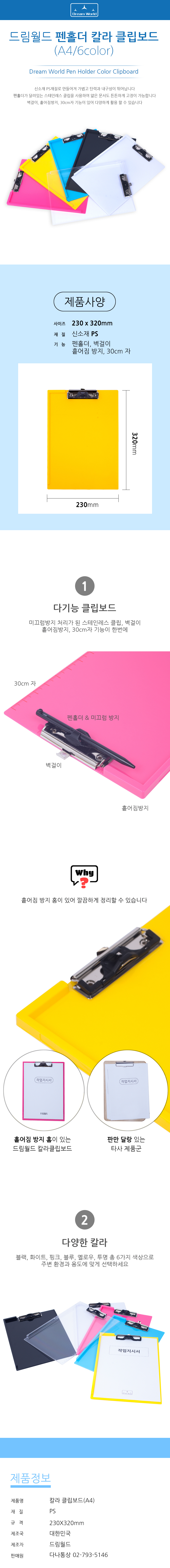 | 품명 및 모델명 | [빨간오리] A4 칼라클립보드 (펜홀더 좌측 흩어진방지 홀더, 벽걸이 홀더 30cm 자 장착) 6색택1 |